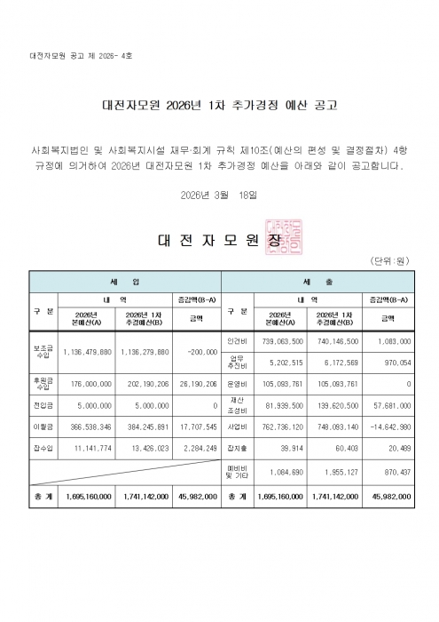 ´ëÀüÀÚ¸ð¿ø 2026³â 1Â÷ Ãß°¡°æÁ¤¿¹»ê °ø°í