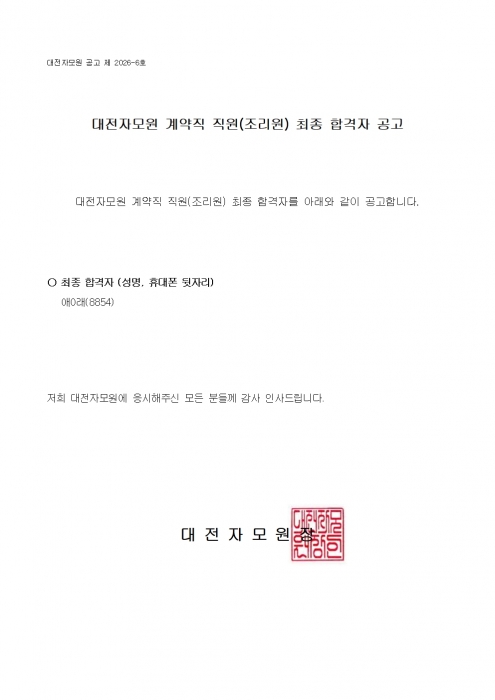´ëÀüÀÚ¸ð¿ø °è¾àÁ÷ Á÷¿ø(Á¶¸®¿ø) ÃÖÁ¾ ÇÕ°ÝÀÚ °ø°í