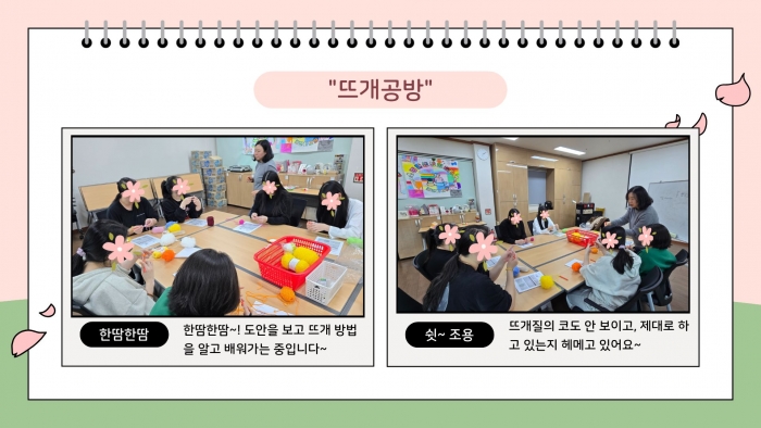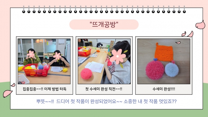 ¿øµ¥ÀÌŬ·¡½º- "¶ß°³°ø¹æ" ÇÁ·Î±×·¥ ÀÚ¿øºÀ»çÀÚÀÇ Áö¿øÀ¸·Î "¶ß°³°ø¹æ" ÇÁ·Î±×·¥À» ÁøÇàÇÏ¿´½À´Ï´Ù. ù ½Ã°£¿¡´Â ½Ç Àâ´Â ¹æ¹ý, ÄÚ ¸ð¾ç ¸¸µå´Â ¹æ¹ý, µµ¾Èº¸´Â ¹æ¹ý µîÀ» ¹è¿ü½À´Ï´Ù. ¶ß°³Áú ½Çµµ ¾Èº¸À̰í, ÄÚµµ µé¾¦³¯¾¦~ ¸ð¾çµµ »ß¶Ô»ß¶Ô~~ Á¦´ë·Î Çϰí ÀÖ´ÂÁö ¾î·Á¿ü½À´Ï´Ù. ÇÏÁö¸¸ µÎ¹øÂ° ½Ã°£ÀÌ µÇ´Ï ½Ç·ÂÀÌ Çâ»óµÈ °ÍÀÌ º¸À̰í~ ¸ð¾çµµ ³ª¿À°í~ µµ¾Èµµ º¼ ¼ö ÀÖ°Ô µÇ¾ú½À´Ï´Ù. ¸¶Áö¸· ½Ã°£¿¡´Â ÀÛǰÀ» ¿Ï¼º~~!!! ¸î ÀÏÀ» Á¤¼ºµé¿© ù ÀÛǰÀ» ¿Ï¼ºÇÏ¿´½À´Ï´Ù. ¼ÒÁßÇÏ°Ô ¿Ï¼ºÇÑ ÀÛǰÀÎ ¸¸Å ¾Æ±â¸¦ À§ÇØ »ç¿ëÇÏ°í ½Í´Ù°í ÇÕ´Ï´Ù~ ±×·¡¼ ù ÀÛǰÀº ¾Æ±â ¿åÁ¶¸¦ ´Û´Âµ¥ »ç¿ëÇϱâ·Î °áÁ¤!!! ¼ÒÁßÇÏ°Ô ¼ö¼¼¹Ì¸¦ »ç¿ëÇϰڽÀ´Ï´Ù~ |