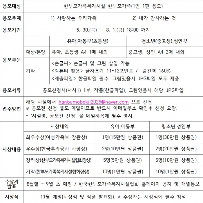 ÇѺθð°¡Á·º¹Áö½Ã¼³ ÇѺθð°¡Á·ÀÇ µ¶¼È°µ¿ »ýÈ°È ¹× Àڱⰳ¹ß ÀÇÁö¸¦ ÀÀ¿øÇϰí Ç¥Çö·Â°ú °ø°¨´ë Çâ»óÀ» À§ÇÑ Çѱ¹ÅõÀÚ°ø»çÀÇ ÇѺθð°¡Á· ±Û¾²±â °ø¸ðÀü¿¡ Àû±ØÀûÀ¸·Î Âü¿©ÇÏ¿© ±âÇѳ» ¸¹Àº ½ÅÃ»ÇØÁÖ½Ã±æ ¿äûµå¸³´Ï´Ù. 1. ÈÄ¿øÃ³: ¿©¼º°¡Á·ºÎ, Çѱ¹ÅõÀÚ°ø»ç 2. ÇѺθð°¡Á·º¹Áö½Ã¼³ ÇѺθð°¡Á· ±Û¾²±â °ø¸ðÀü-°¡Á·»ç¶û°ú °¨»ç- °³¿ä